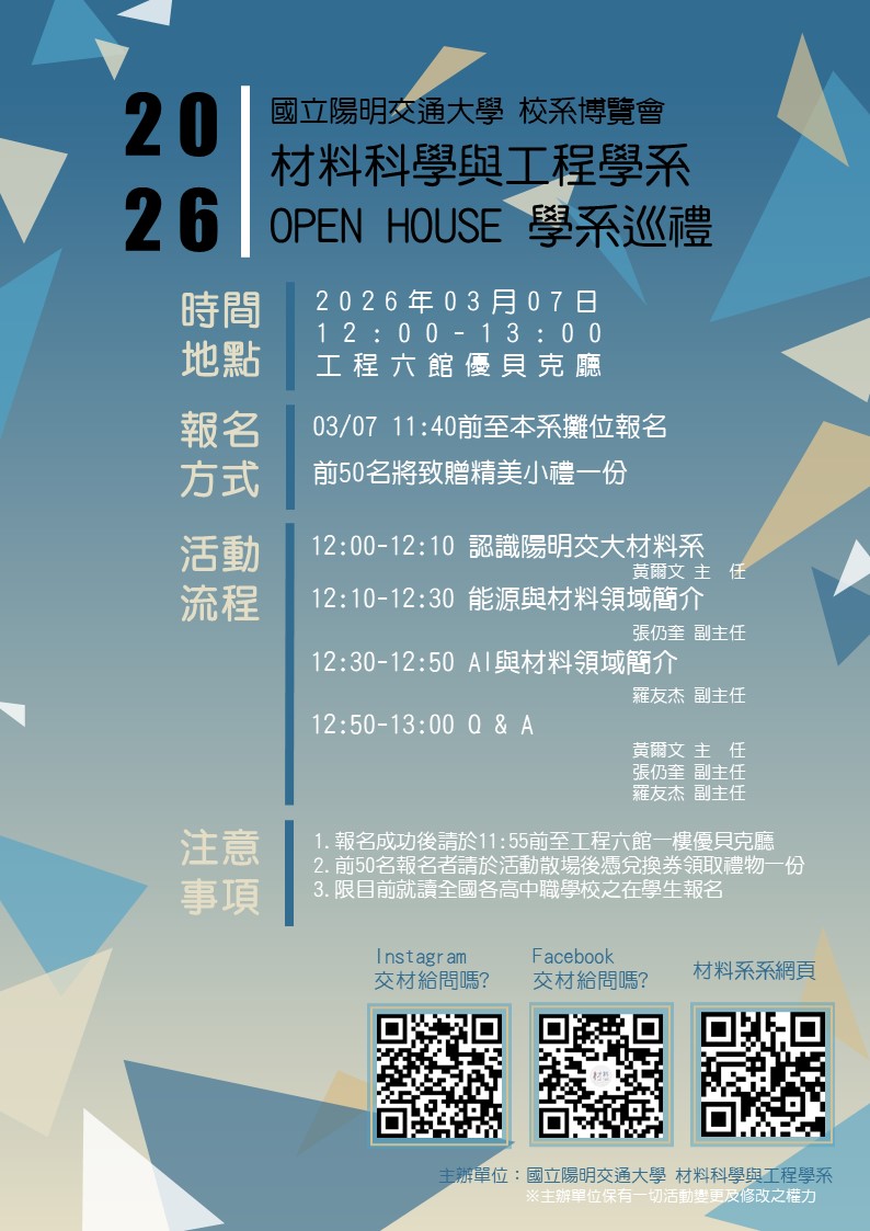 | 日期 03/02/2026 | 2026.03.07 學系博覽會&材料系open house學系巡禮活動 |