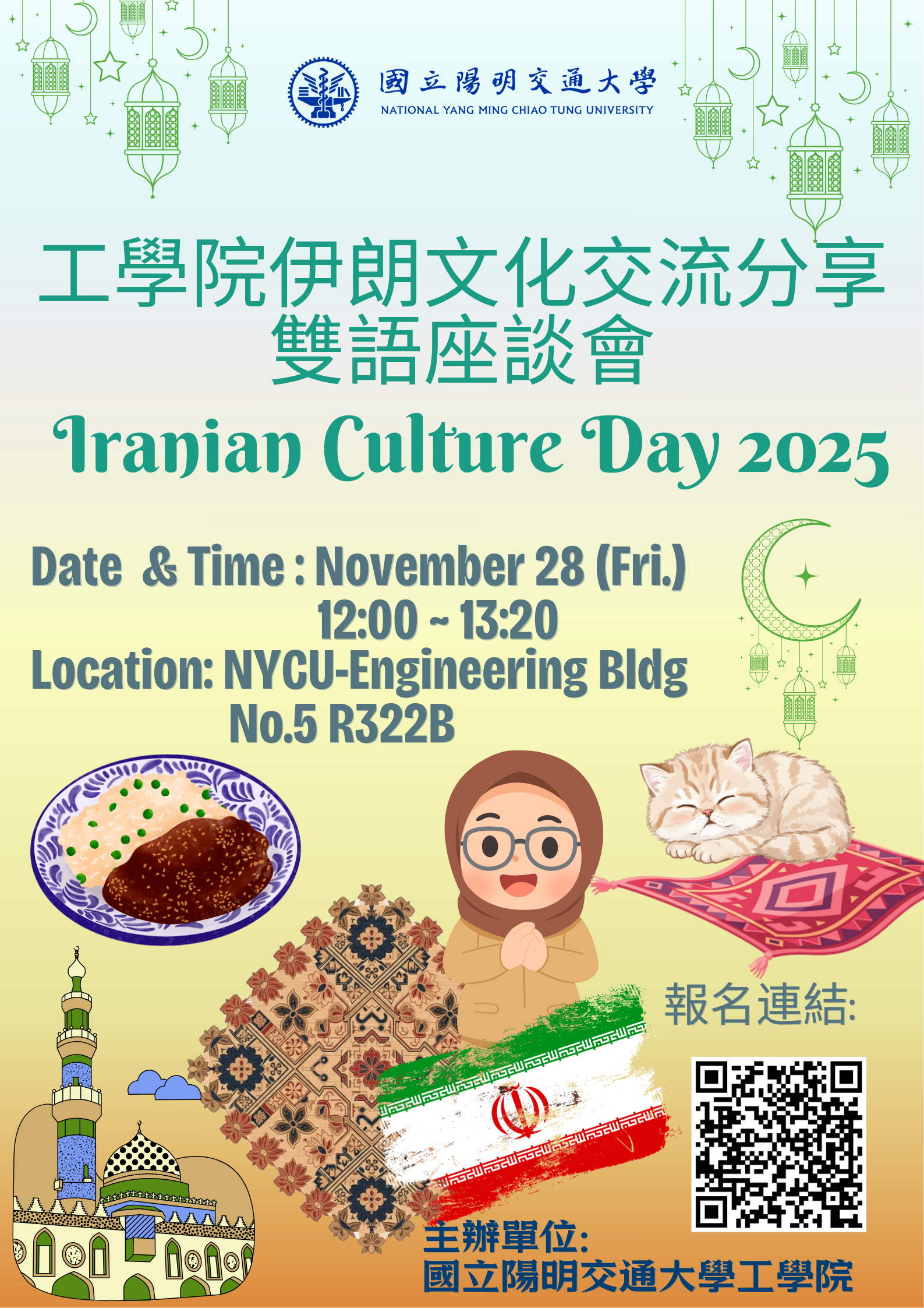 工學院伊朗文化交流分享座談會International Day Event at the College of Engineering, NYCU伊朗文化交流分享會為了促進校園多元文化交流,認識不同文化背景的同學們,很高興本次邀請到工學院伊朗籍的同學們跟大家一起分享...